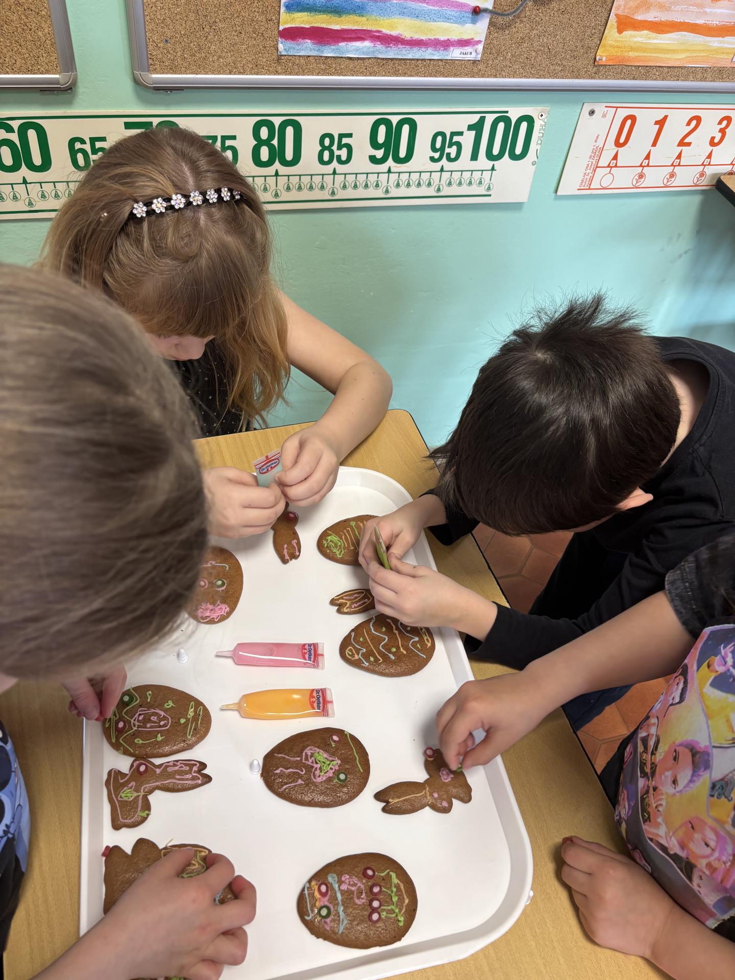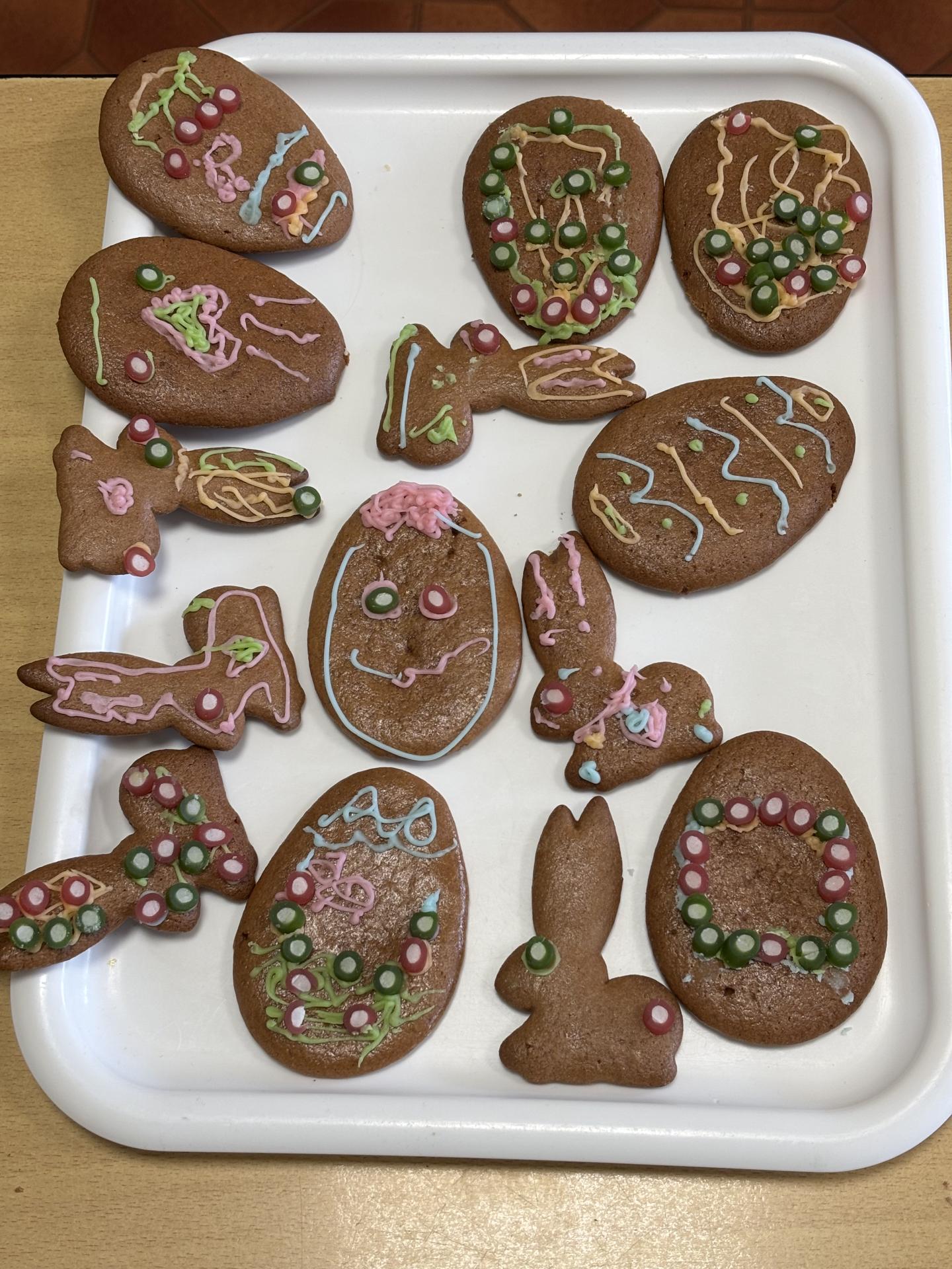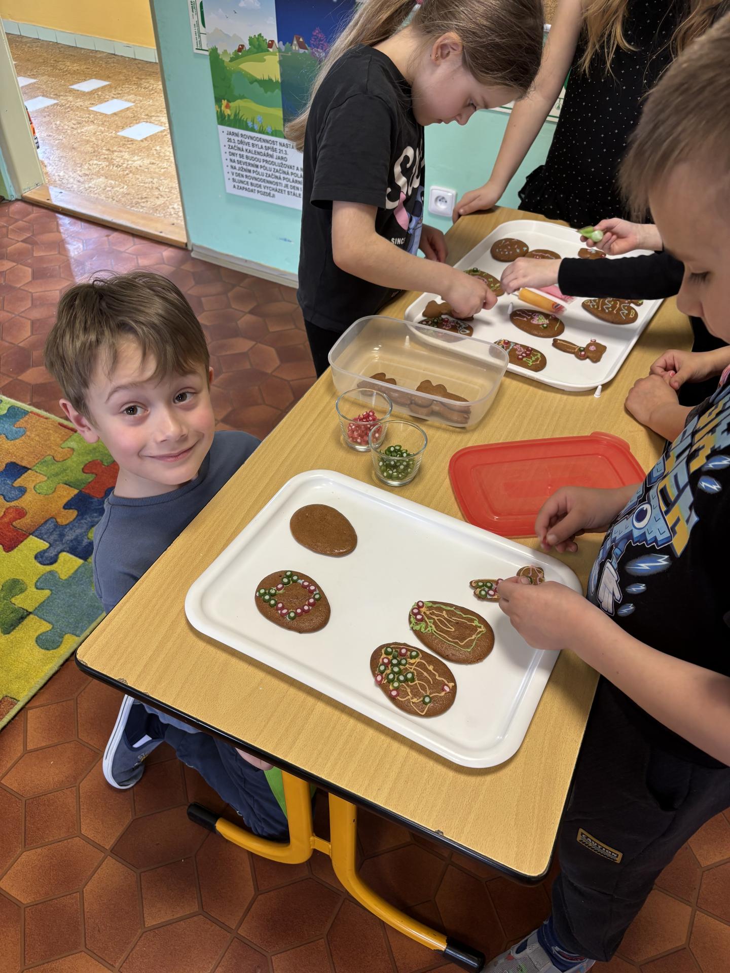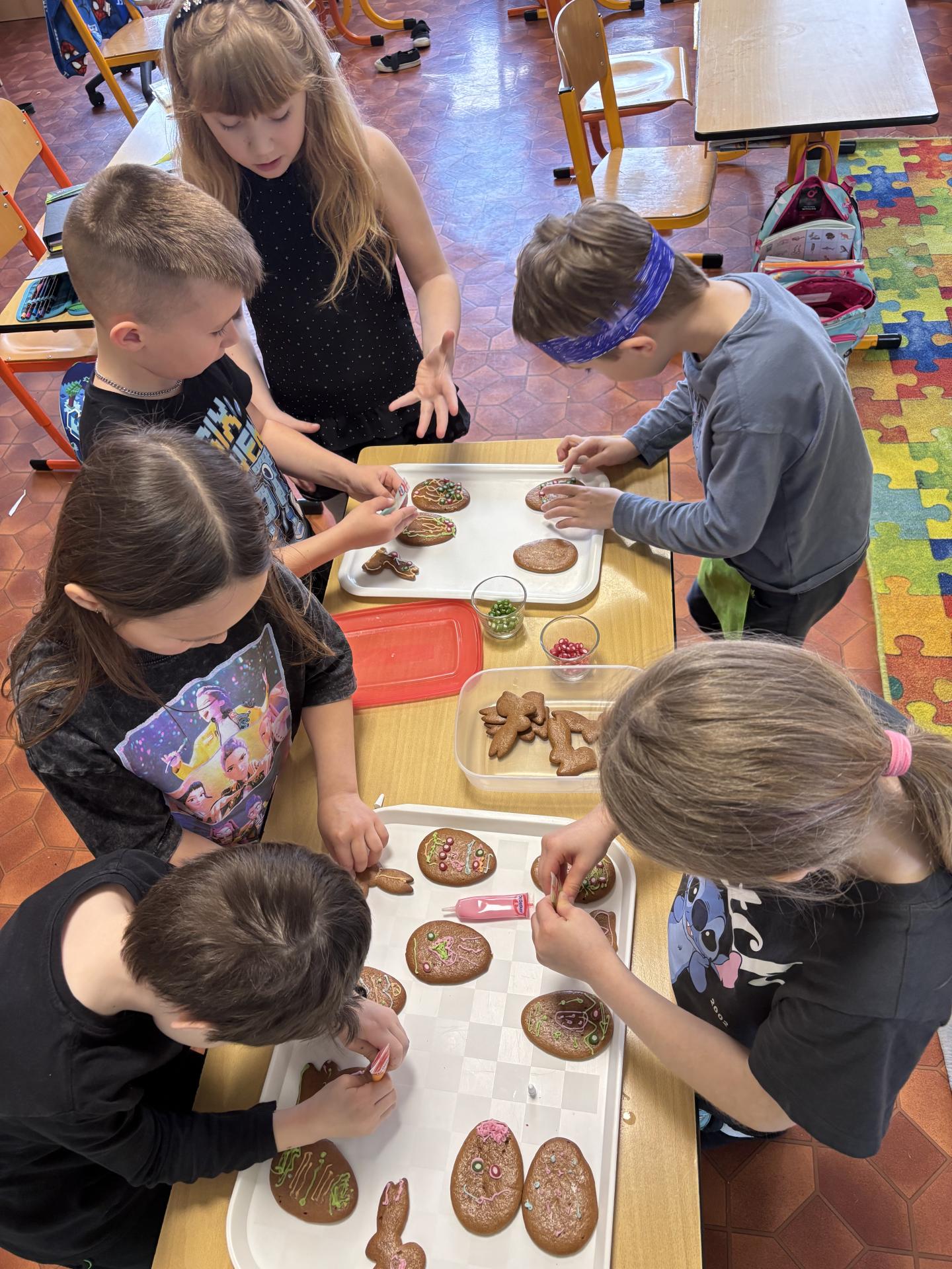 Potom jsme se pustili do zdobení velikonočních perníčků ve tvaru zajíčků a vajíček. Barevnými zdobičkami jsme perníčky krásně ozdobili – a protože jsme na ně při práci dostali velkou chuť, některé jsme si rovnou snědli.