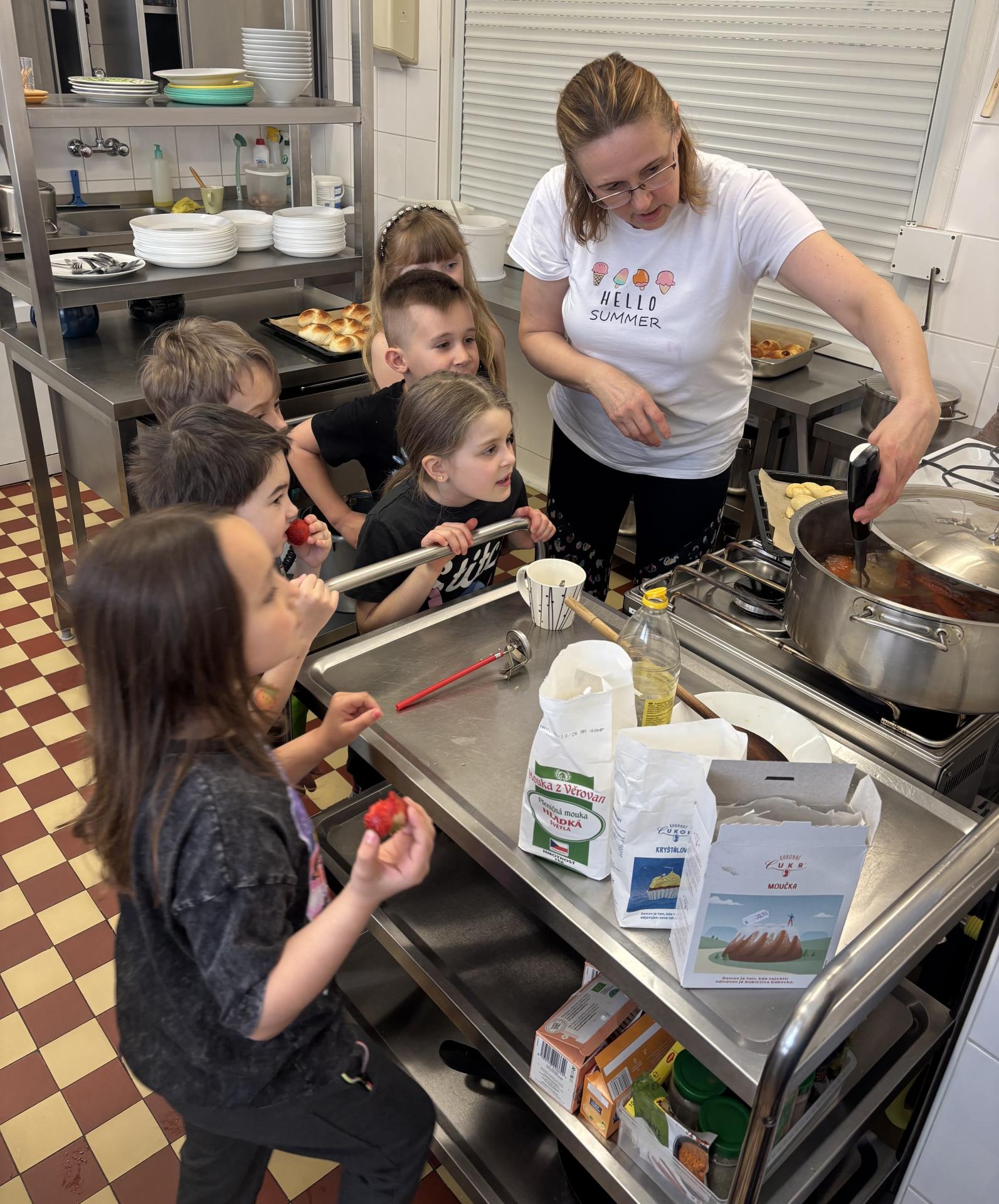 Paní kuchařka nám také ukázala, jak to chodí ve školní kuchyni, a pověděla nám něco o tom, jak se připravují jídla pro všechny děti ve škole.