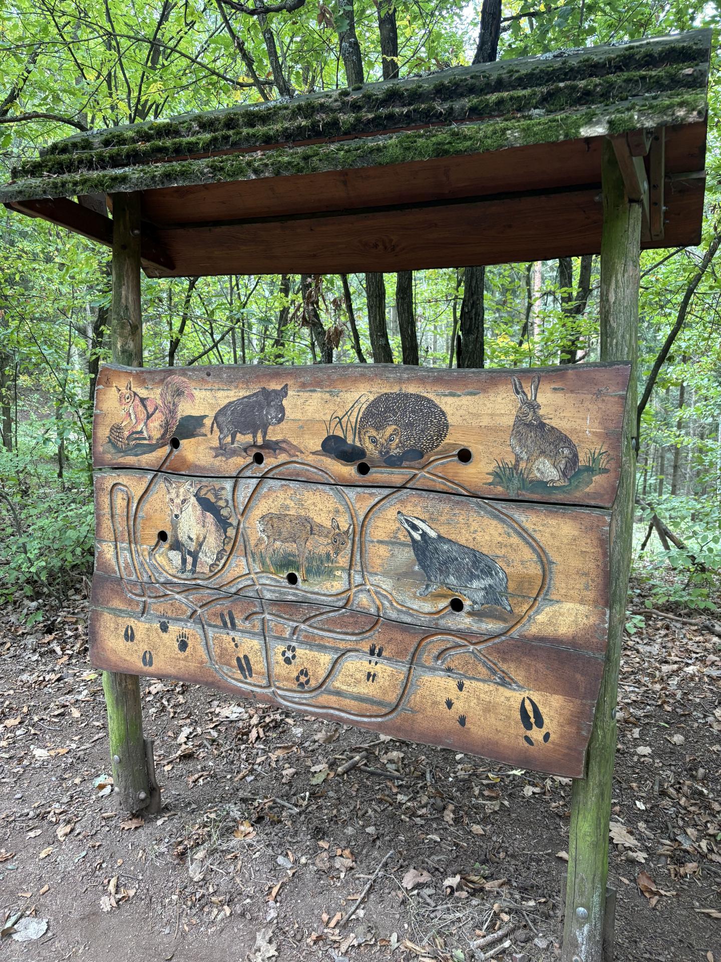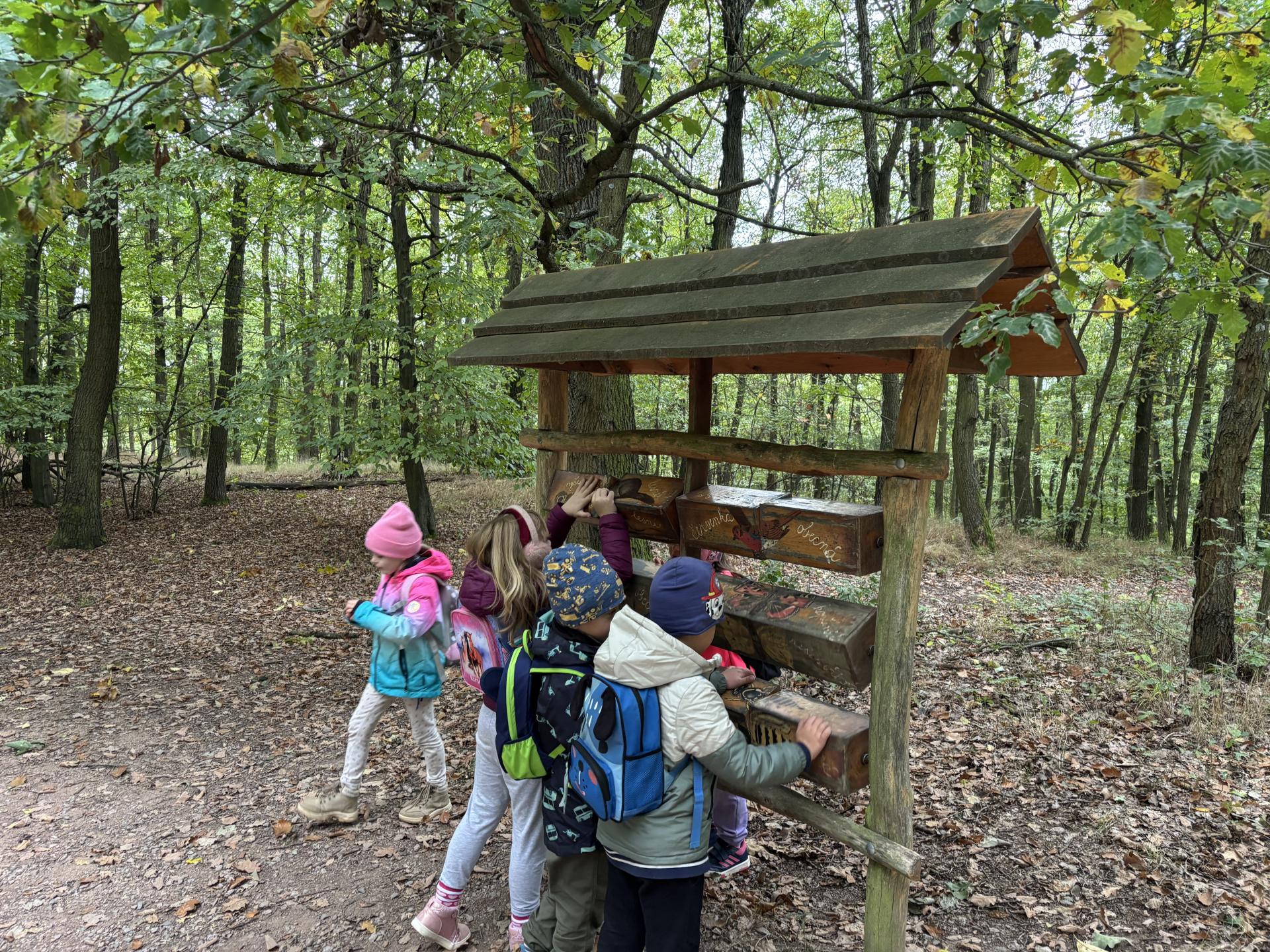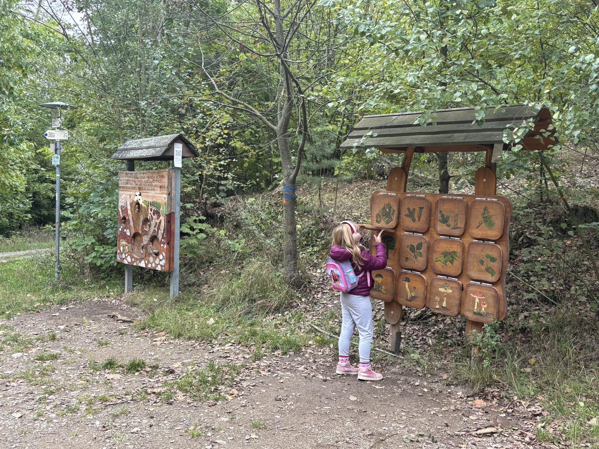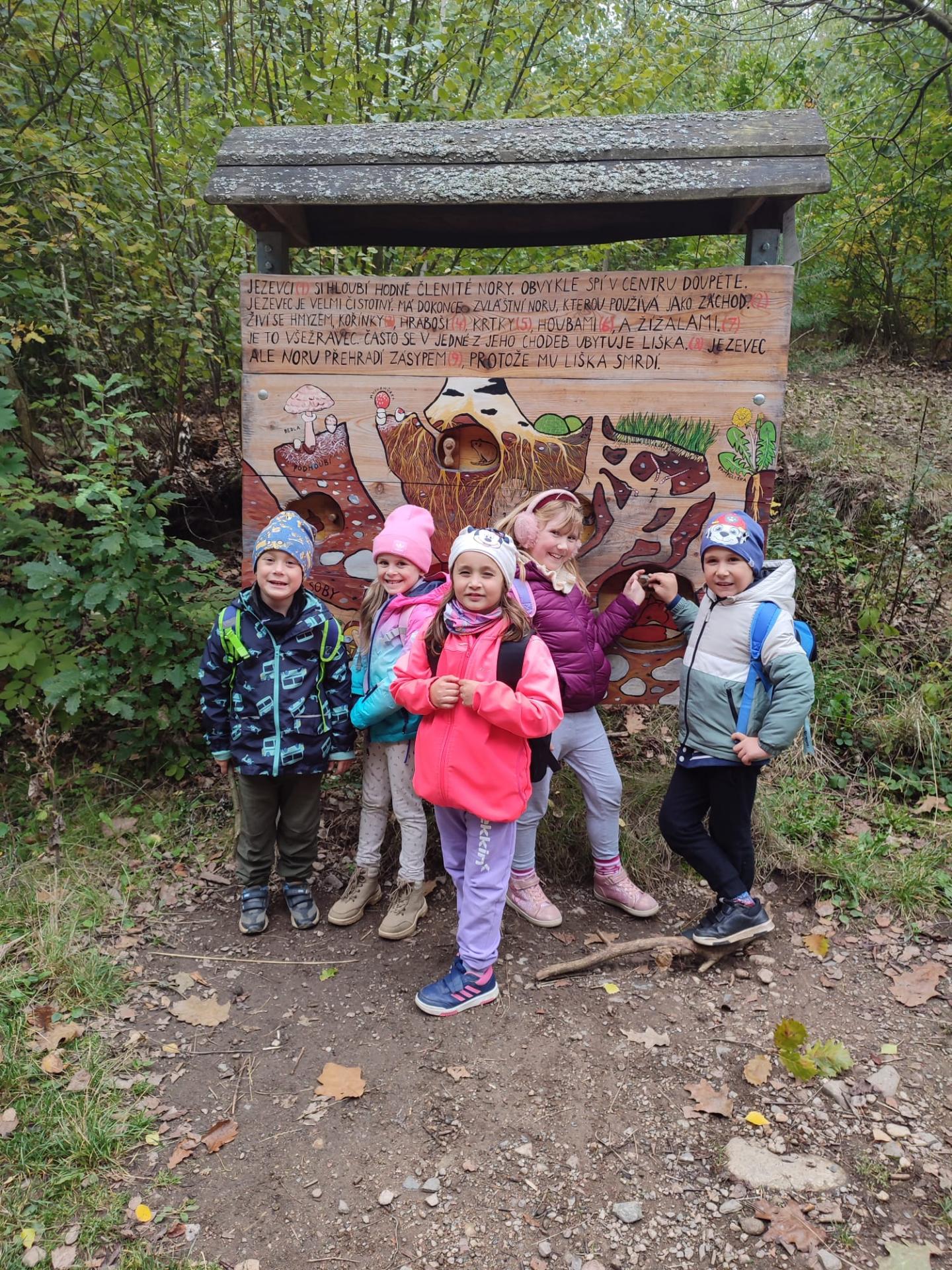 Naše trasa vedla přes vyhlídku Sychrák, kde jsme si odpočinuli a posilnili se řízkem. Odtud jsme pokračovali po rodinné naučné stezce Klucanina – cestou jsme míjeli interaktivní naučné tabule, které nás zaujaly spoustou zajímavostí o zvířátkách, rostlinách i houbách této oblasti.